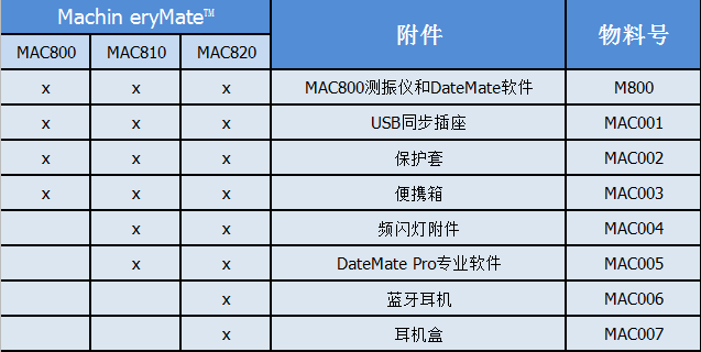 通過配套的Data Mate軟件,MAC800手持巡檢測(cè)振儀可成為全廠狀態(tài)監(jiān)測(cè)項(xiàng)目的基石,能支持10臺(tái)機(jī)器監(jiān)測(cè)。若升級(jí)到DataMate Pro專業(yè)版軟件,則可監(jiān)測(cè)無限制臺(tái)數(shù)機(jī)器。MAC800測(cè)振儀可用于眾多行業(yè)的狀態(tài)監(jiān)測(cè),例如商業(yè)及工業(yè)暖通空調(diào)(HVAC),食品加工,包裝,化工,制漿造紙,電廠及市政等等??蛇x配的增強(qiáng)功能包括:高性能藍(lán)牙耳機(jī)用于聲學(xué)監(jiān)測(cè),頻閃燈附件用于轉(zhuǎn)速分析。MachineryMate™組件含有各類附件。參考下面的訂購指南,可根據(jù)您的監(jiān)測(cè)需求找到從基礎(chǔ)到高級(jí)的各種方案。